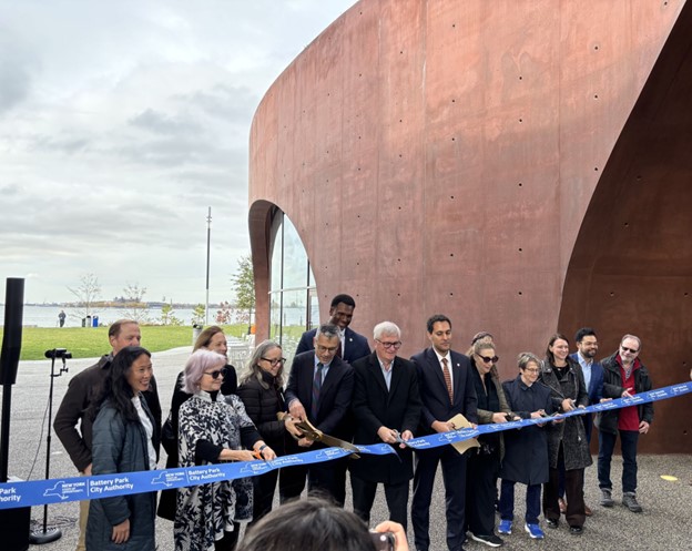 Battery Park City Authority (BPCA) with local elected officials, community leaders, and project partners last week celebrated the opening of the Wagner Park Pavilion, the central structure of the new Robert F. Wagner, Jr. Park, which reopened in July after a major reconstruction to address urgent climate resilience needs. The centerpiece of BPCA’s South Battery Park City Resiliency Project, and part of New York City’s overall Lower Manhattan Coastal Resiliency Project (LMCR) to aimed at reducing flood risk due to coastal storms and sea level rise in Lower Manhattan, the Pavilion’s rooftop garden offers sweeping views of the Statue of Liberty, Ellis Island and Hudson River, and new restrooms are now open to the public. A classroom/community space will debut within the pavilion early next year, and with a restaurant to follow in Summer 2026.
