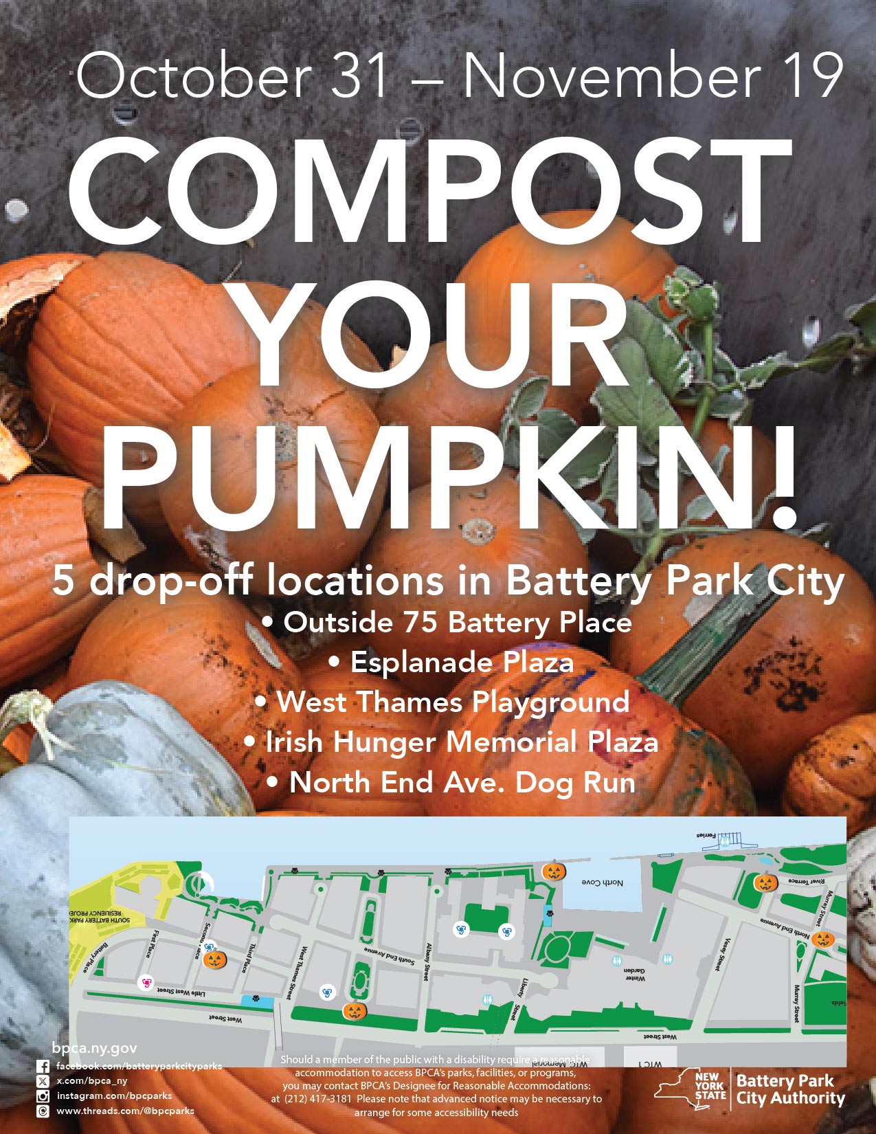 Four gourd and several years ago, our Parks Operations team brought forth in Battery Park City a new notion, conceived in sustainability, and dedicated to the proposition that all pumpkins can be composted. Beginning today, BPCA is once again accepting pumpkins as part of its annual Operation Pumpkin Drop – simply leave your pumpkins in the gray bins at any of the five locations below and they’ll be sustainably composted and used to create a quality soil fertilizer.