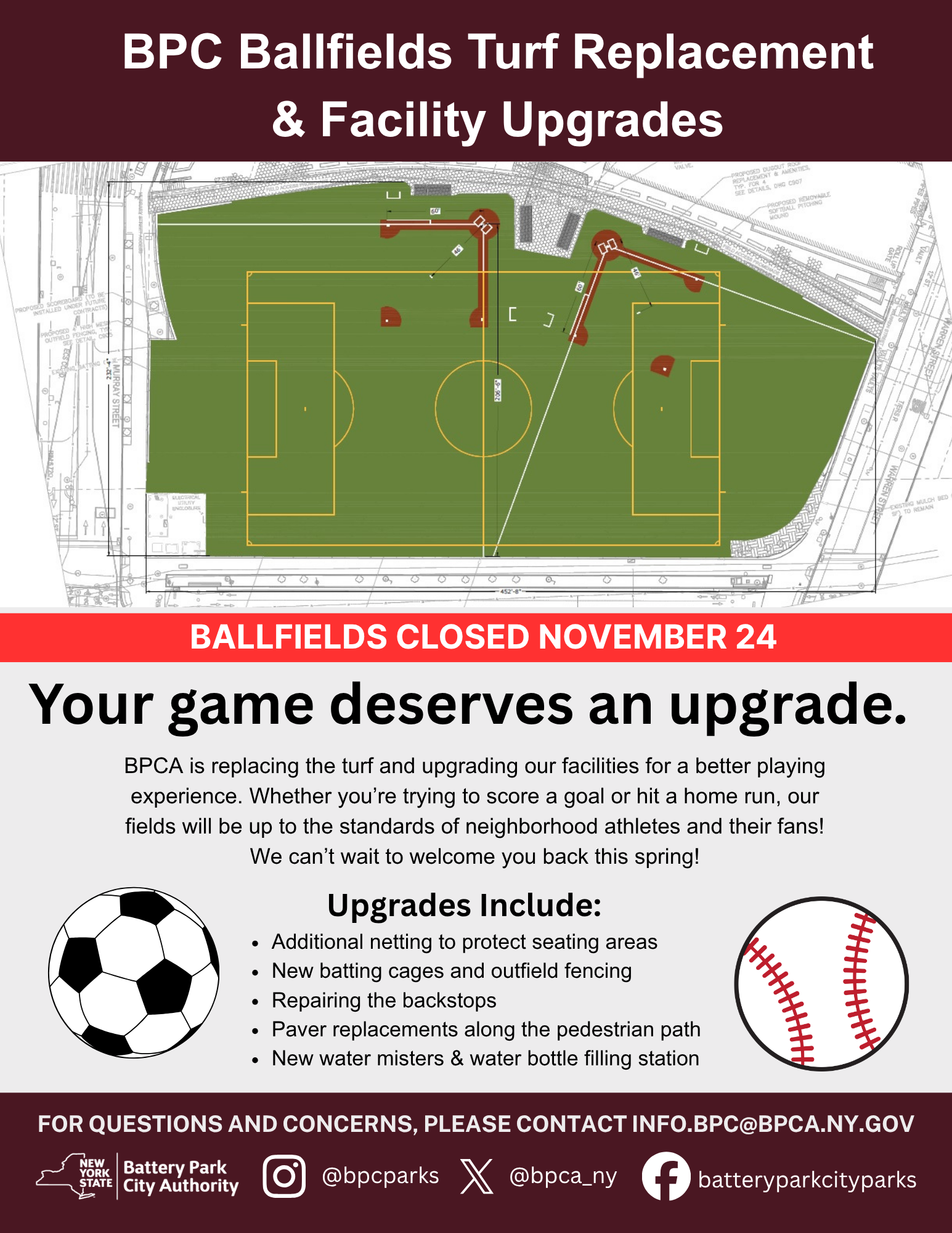 Beginning Monday, November 24, the BPC Ball Fields will be closed to facilitate turf replacement and facility upgrades. As a result, no permits will be issued for field use during the Winter 2025-2026 season. The fields are scheduled to reopen to the public on Monday, March 2, 2026.